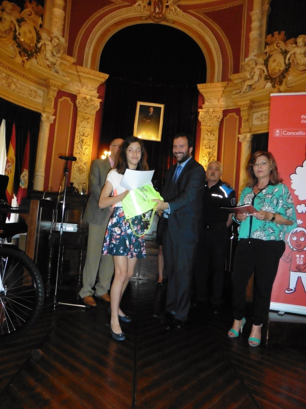 O 14 de xaneiro deste ano fomos ao Parque Infantil de Tráfico, situado en Expourense, para traballar a educación viaria, como xa comentamos neste blog. Unha das actividades que fixemos foi andar en bicicleta por un circuito e dúas compañeiras da nosa clase, Noelia Carnero e Nerea Vidueiras, foron seleccionadas para participar no Concurso Provincial de Educación Viaria que tivo lugar tamén en Expourense o día ás 16:30 h. Noelia Carnero quedou semifinalista e recibiu de agasallo un trofeo en metacrilato, ademais dun diploma. Nerea Vidueiras recibiu un pen-drive e tamén un diploma. Todos os compañeiros queremos felicitalas e darlles a NORABOA. Aquí tedes inmortalizado o momento da entrega de premios.