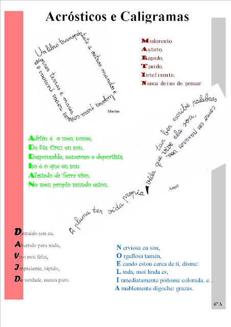 Estase confeccionando un novo número da REVISTA ESCOLAR e, entre outras aportacións, a nosa clase fixo estes acrósticos e caligramas.